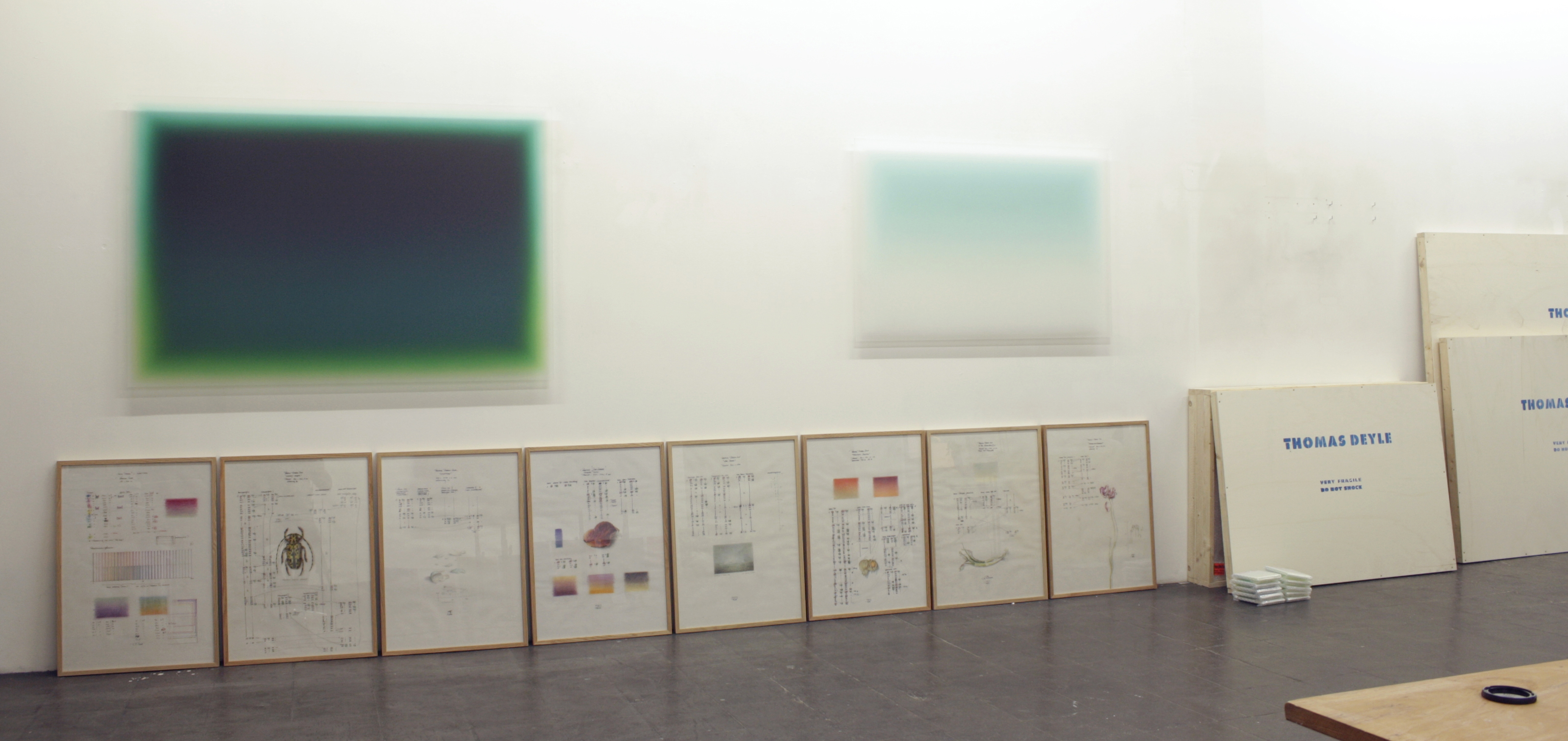 Die »Partituren« (je 70 x 50 cm) zu meinen Arbeiten dokumentieren die gezeichnete Inspirationsquelle zu der jeweiligen Farbigkeit der Malerei und die Kompositionsideen für den Farbverlauf. Die Zahlenreihen zu dem jeweiligen Farbton resultieren aus dem Schichtenaufbau und stellen eine Art Tagebuch der Schichtenarchitektur dar. Beim Malprozess werden vier Gummischnüre über die Acrylglasplatte gespannt, die nach bestimmten mathematischen Parametern verschoben werden und die jeweils nächste zu malende Lasur eingrenzen. Diese Begrenzungswerte werden während des Prozesses eben in diesen Zahlenkolonen dokumentiert. Die Bezeichnung »Partitur« für meine Zeichnungen ergibt sich aus der Überlegung, dass man anhand der Partitur die Arbeit ein weiteres Mal erstellen könnte.