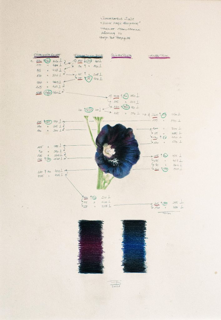 Titel: Scarbaeus 2021 Black Magic Hollyhock Jahr: 2021 Kategorien: Scarabaeus Technik: Acryl auf Acrylglas Größe: 130 x 130 cm Untertitel: Partitur, Mischtechnik auf Papier, 70 x 50 cm x 50 cm