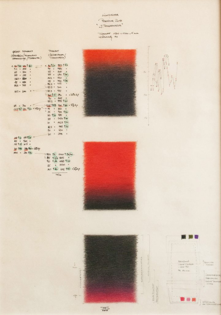 Titel: Lichtdeuter 2013 J. Bonamassa Jahr: 2013 Kategorien: Lichtdeuter Technik: Acryl auf Acrylglas Größe: 150 x 120 cm Untertitel: Partitur, Mischtechnik auf Papier, 70 x 50 cm