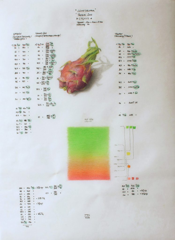 Titel: Lichtdeuter 2013 Cygnus Jahr: 2013 Kategorien: Lichtdeuter Technik: Acryl auf Acrylglas Größe: 150 x 120 cm Sammlung: Privatsammlung Karlsruhe Untertitel: Partitur Lichtdeuter 2013 Cygnus Mischtechnik 70 x 50 cm
