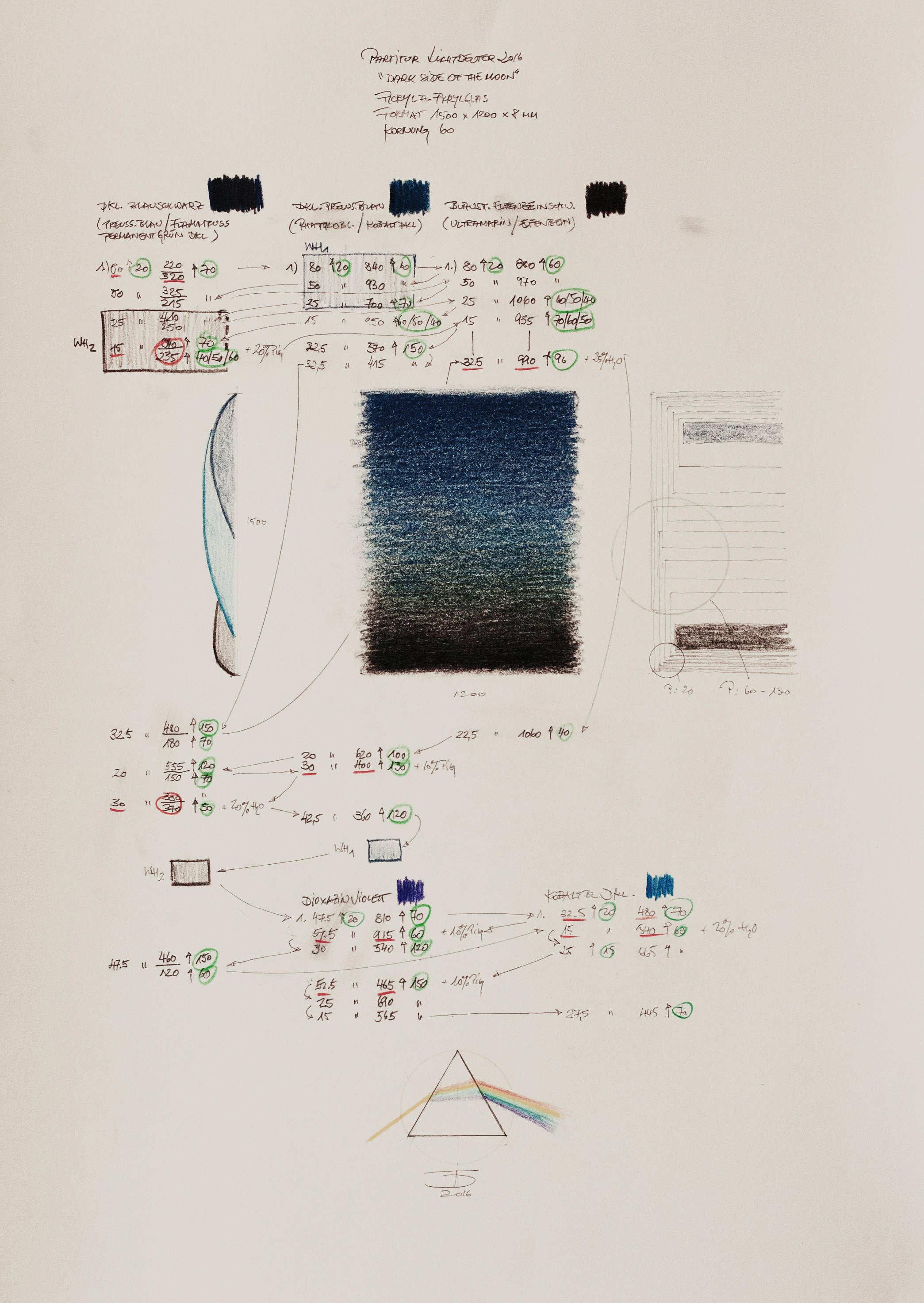 Titel: Lichtdeuter 2016 Dark Side of the Moon Jahr: 2016 Kategorien: Lichtdeuter Technik: Acryl auf Acrylglas Größe: 150 x 120 cm Untertitel: Partitur, Mischtechnik auf Papier, 70 x 50 cm