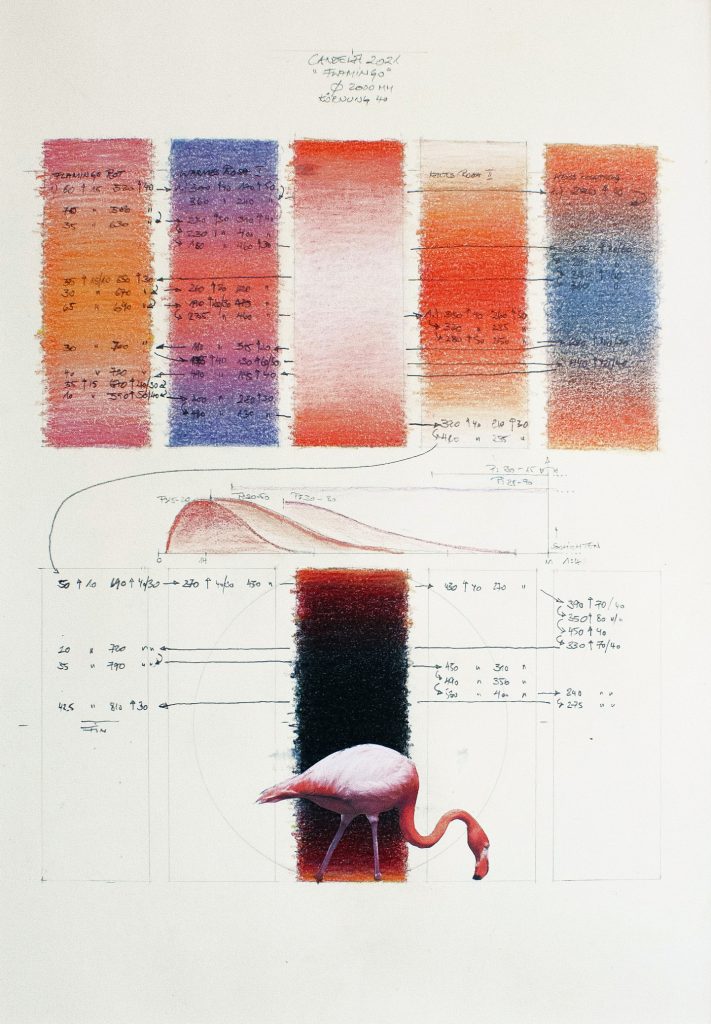 Titel: Candela 2021 Flamingo Jahr: 2021 Kategorien: Candela Technik: Acryl auf Acrylglas Größe: 200 cm Durchmesser Untertitel: Partitur, Mischtechnik auf Papier, 70 x 50 cm