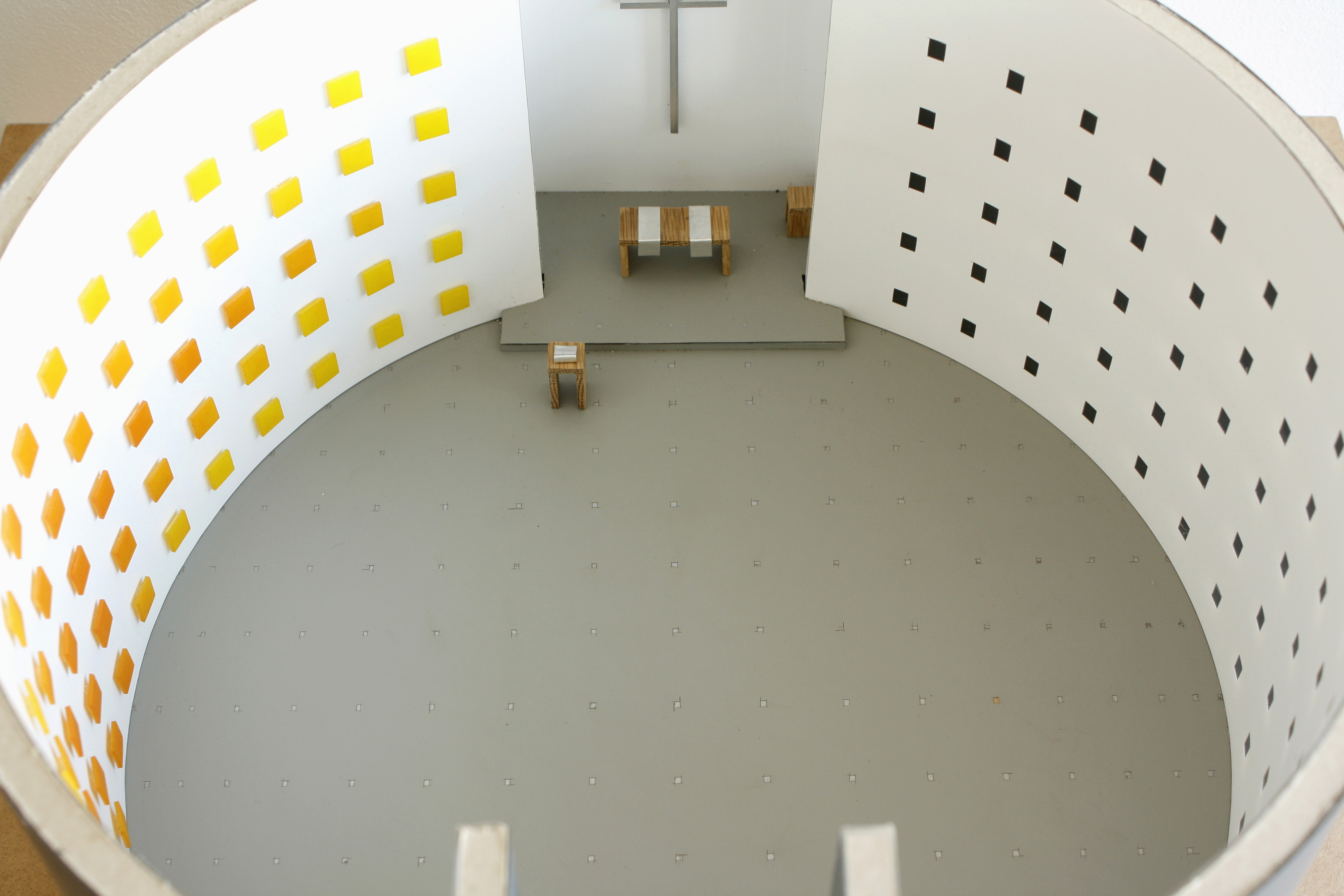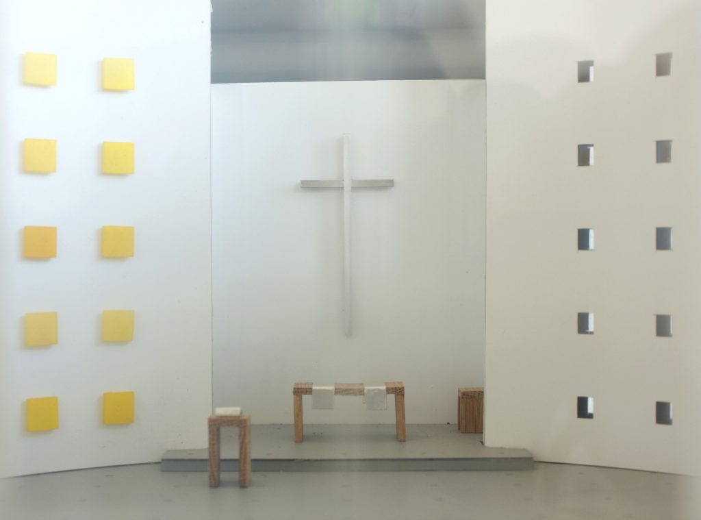 Gestaltungsaufgabe des Kirchenneubaus: Altarraum mit Kreuz, Altar Kanzel, Taufbecken, Tabernakel, Kirchengestühl und eine Wandmalerei. Das aus Acrylglasblöcken bestehende Malereiobjekt bezieht sich auf das Fensterraster in der gegenüberliegenden Wand. Es wurde mit einem Farbverlauf bemalt, der sich zu einem Kreuz formiert. Bei der grundsätzlichen Gestaltungsidee wurde die Ordensphilosophie der St.Clara, das weibliche Pendant zu St. Franziskus, zu Grund gelegt.