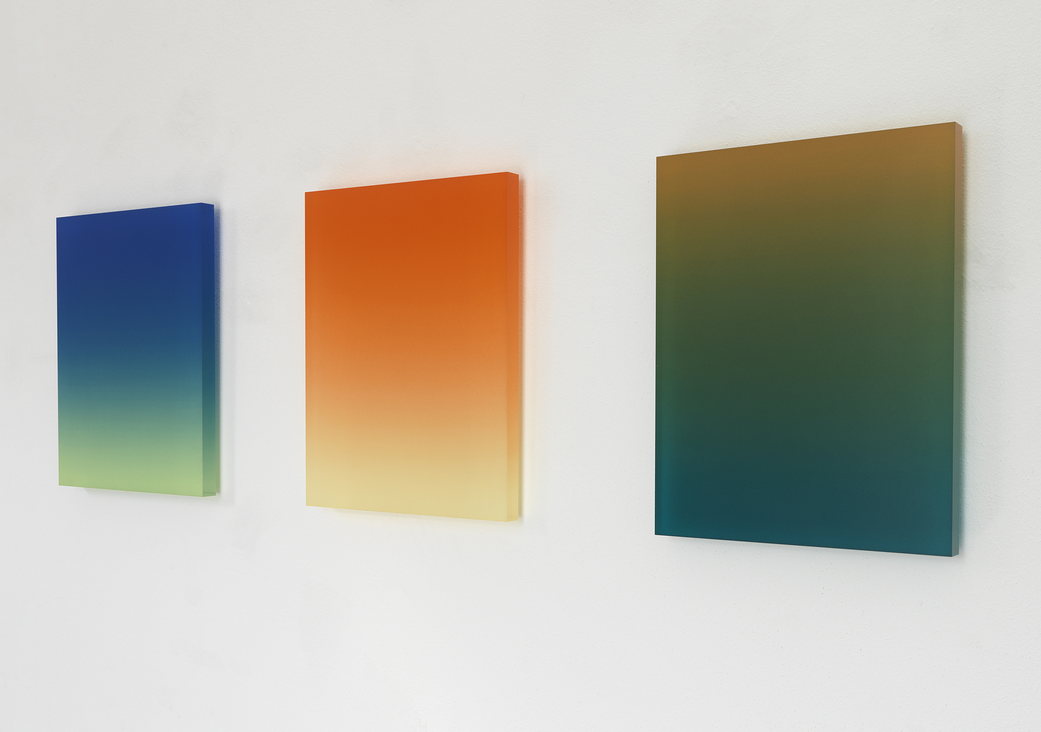 Titel: Tokonoma No. 2.06 + 6.06 + 4.07 Jahr: 2006 Kategorien: Tafeln Technik: Acryl auf Acrylglas Größe: 44 x 35 x 3,5 cm